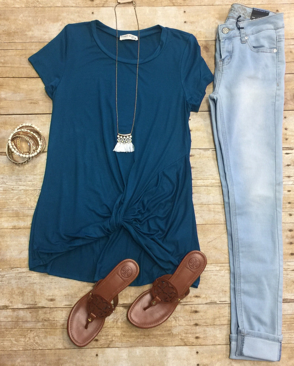 This Top is fabulous with its cute knot detail it is perfecto for any size! Very flattering no matter what your size!